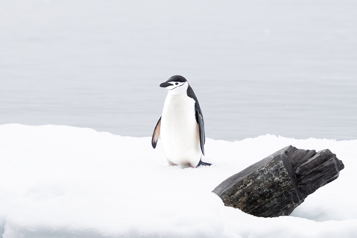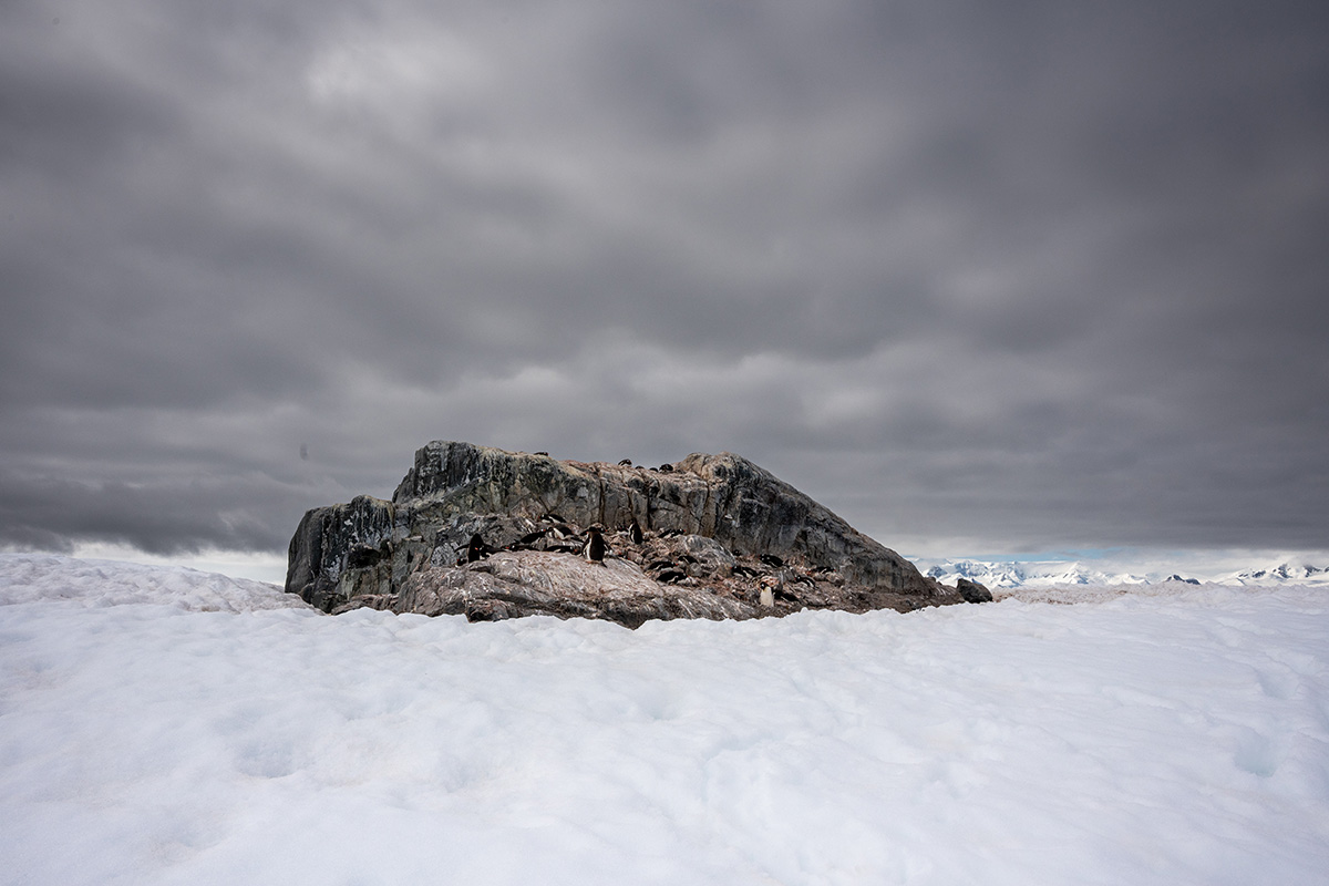 We hiked for a few meters and soon found a colony of Gentoo penguins, grouped on top of one of the only snow-free rocks in this part of the mountain. By the way, Gentoo penguins (Pygoscelis papua) tend to choose rocks to build their nests and rest from long hours of diving in search of food in the Southern Ocean.