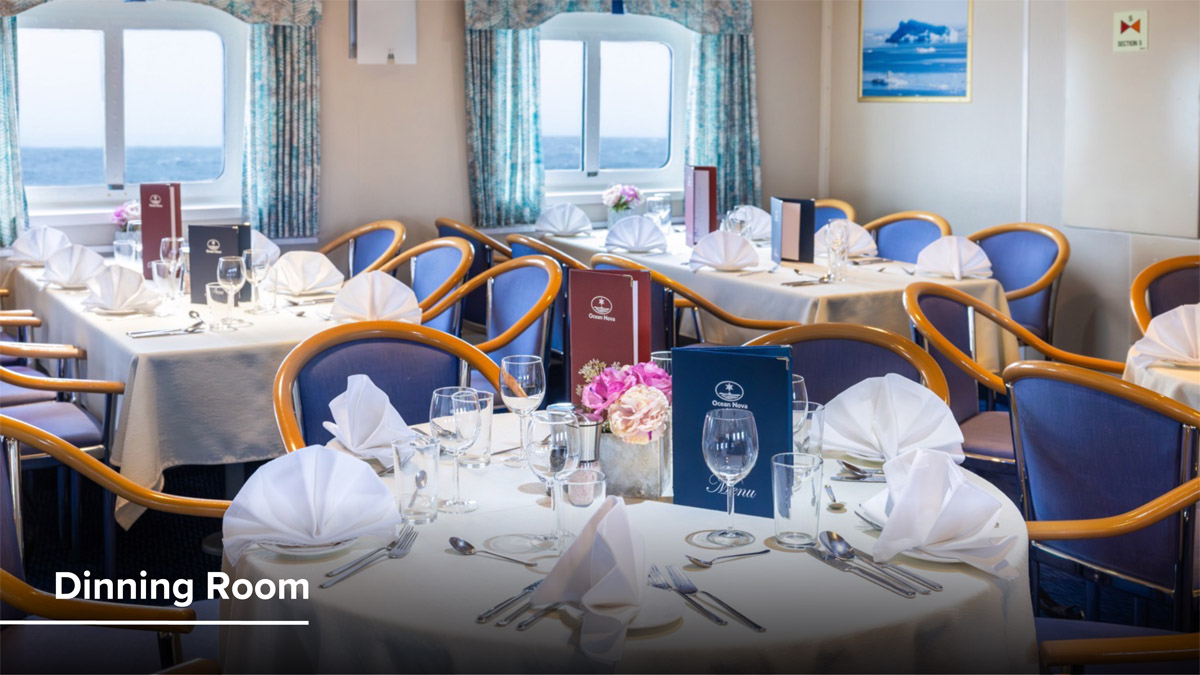 Meals feature open seating and ocean views, with globally inspired options to suit all tastes—including vegetarian and fish dishes. Desserts, made fresh daily, are a highlight. Special diets? We've got you covered! On the Ocean Nova, every moment connects you to nature, each other, and discovery.