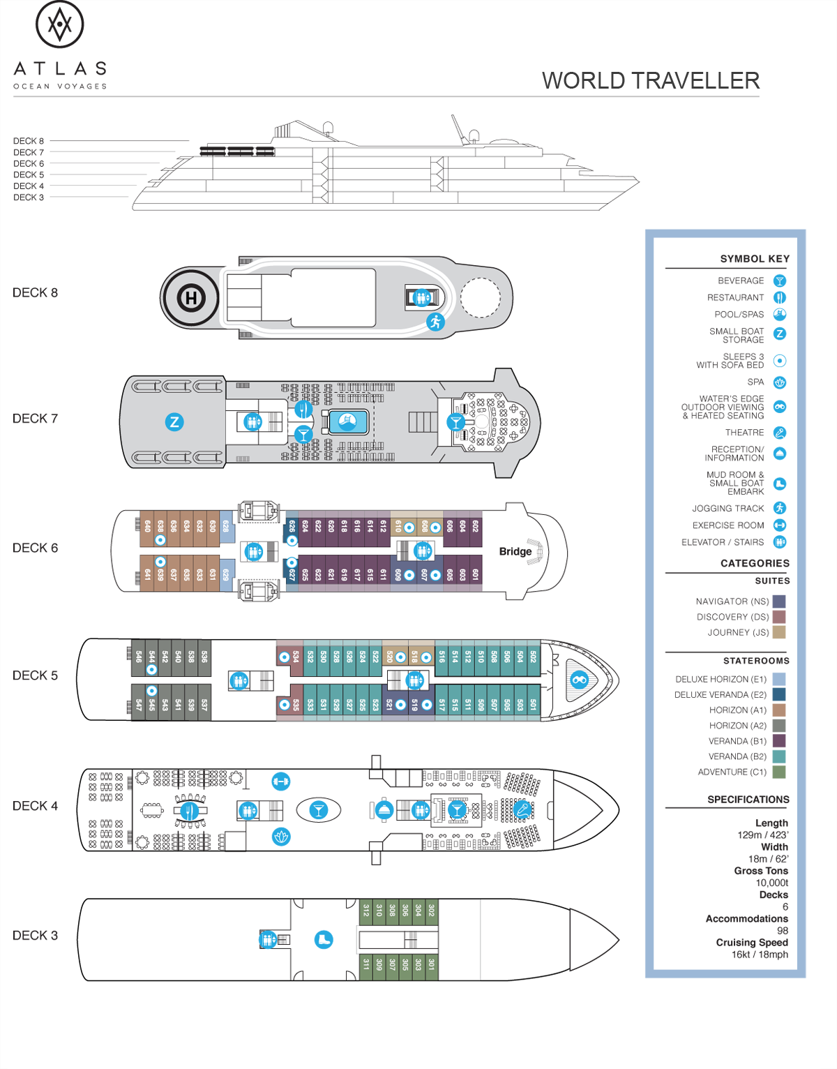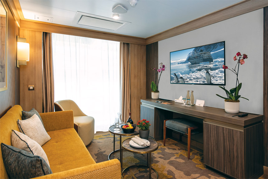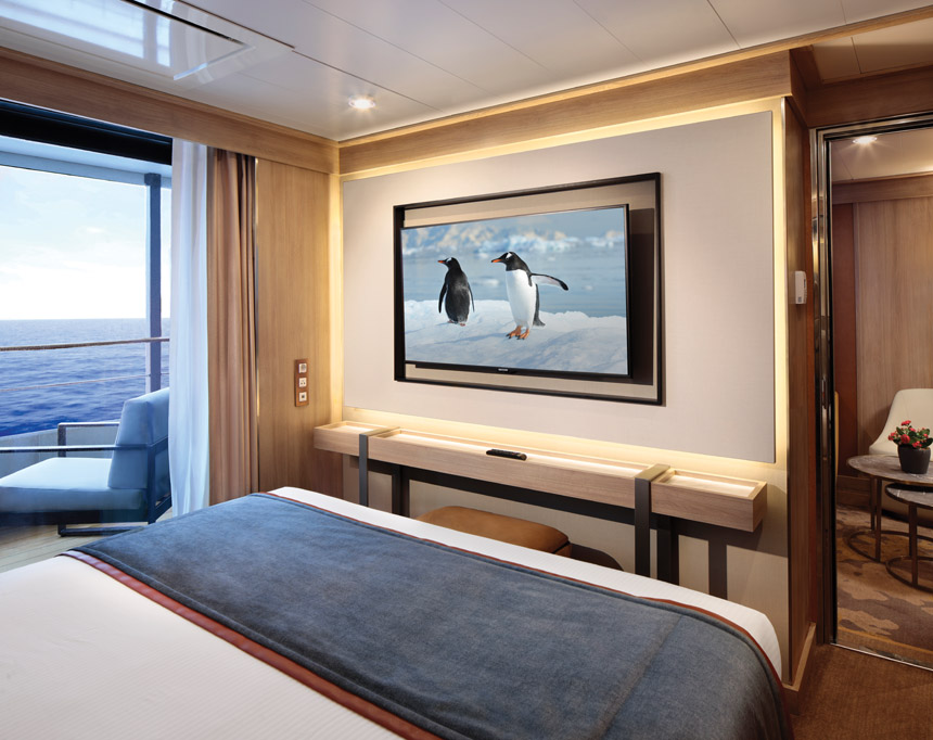 The 98-suite World Traveller features deluxe accommodations, contemporary and airy design, as well as thoughtfully selected amenities, entertainment, restaurants and bars. Every deck is designed to bring the outdoors inside, so that you are almost never without a transcendent view.